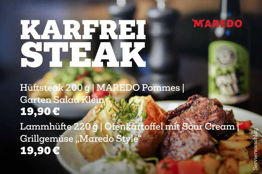 Freu dich auf 250g Flanksteak mit MAREDO Pommes und Chimichurri-Mayo im Steak Deal für nur 19,90 €. Und passend dazu, alle Biere vom Fass für nur 4,90 €. Egal ob Steak-Fan oder Bierliebhaber, bei uns kommt jeder auf seine Kosten!